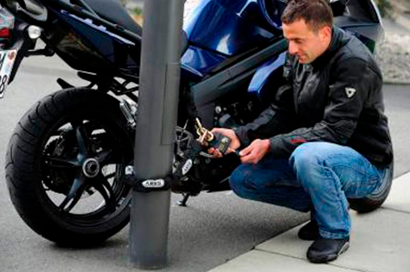- Utiliza elementos de seguridad: Además del bloqueo de la dirección, usa al menos uno de los muchos dispositivos antirrobo que hay en el mercado, tales como: cadena (tipo pitón o de combinación), horquillas, pinza de disco, o alarmas. Intenta asegurar la misma a un objeto que no se mueva como un ancla de suelo o un poste de luz. Si esto no es posible, te sugerimos que pases la cadena por alguna zona de tu moto y la rueda trasera para que quede trabada e inamovible. Y, aunque te parezca ridículo, antes de marcharte, revisa que llevas las llaves contigo: si se te caen al lado o te las dejas puestas (pasa mucho más de lo que crees), ¡no habrá nada que te salve!