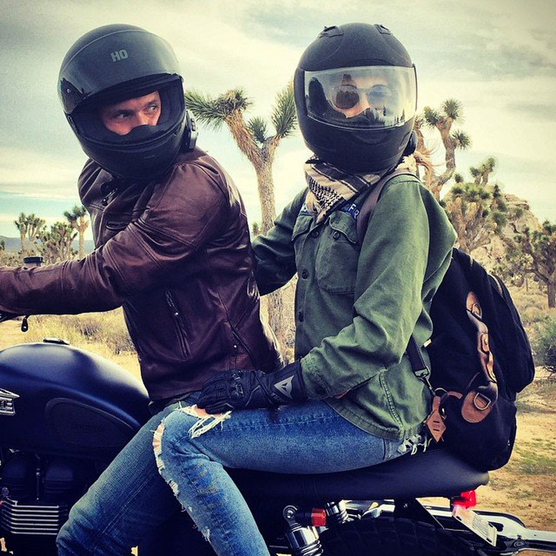 La pareja ha sido vista en distintos escenarios sobre una motocicleta Triumph Boneville con detalles en azul ultramarino mate. Tal parece que aun antes de unir sus vidas cada uno disfrutaba del placer de las dos ruedas, así que el estar juntos sólo lo hizo aún más agradable.