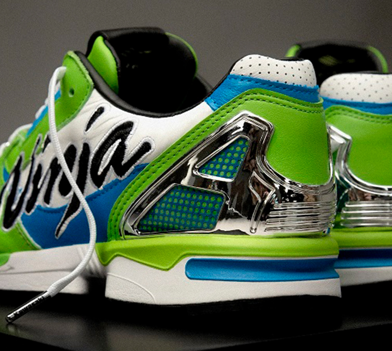 El primer par está compuesto por unas Adidas ZX 8000. Llegan con una parte superior fabricada en piel de canguro perforado en blanco, con superposiciones de cuero verde al estilo de Kawasaki. Cuenta con detalles en cuero azul y el logotipo Ninja en los laterales. Los emblemas de ambas marcas colaboradoras, decoran las lengüetas negras y piezas plateadas, situadas en el contrafuerte del talón.