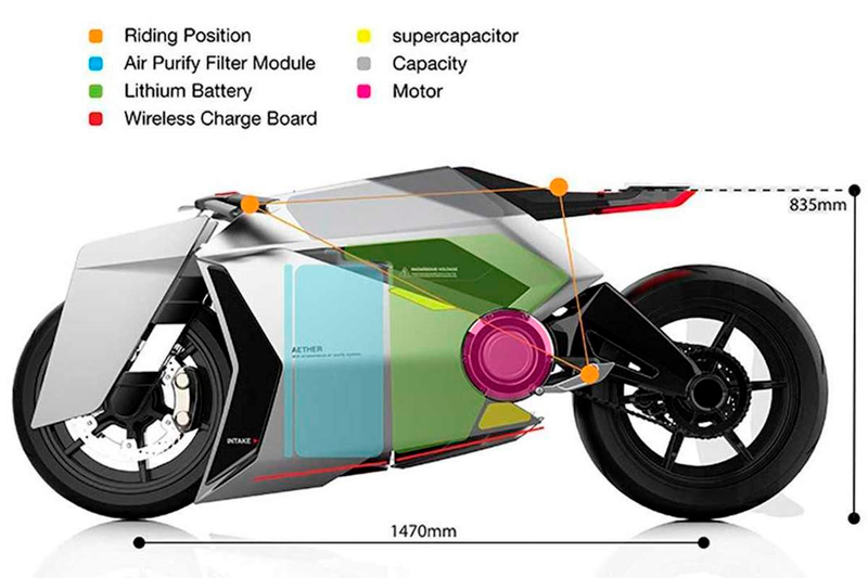 Como ya habíamos mencionado, esta motocicleta que parece un sueño se trata solamente de un prototipo que se encuentra circulando de una moto eléctrica, a la que se le denomina Aether que ha sido creada por Lin Yu Cheng, la cual cuenta con carga inalámbrica y lo que nos ha llamado más la atención es que es capaz de purificar el aire de monóxido de carbono, todo esto mientras circula.