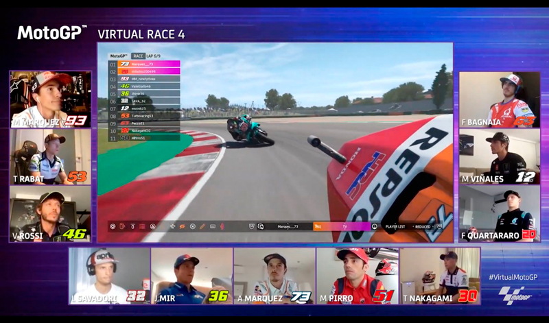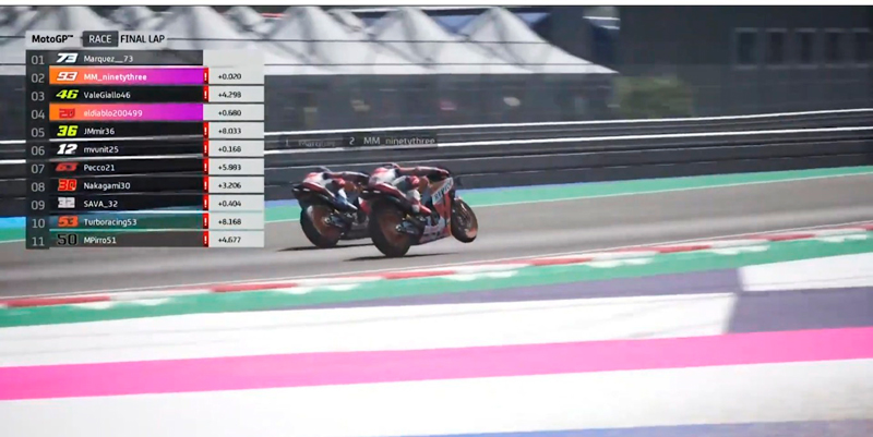 La carrera fue un espectáculo por la emoción que ofreció hasta la última curva. Si algo se está viendo en estas carreras virtuales es que Marc Márquez, aunque no tiene tanto ritmo como otros, comete pocos errores, y eso fue lo que ayer lo había colocado en primera posición faltando tan solo dos vueltas para el final de la carrera.