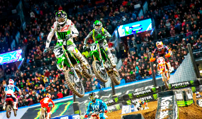 El pasado fin de semana se llevó a cabo la 15ª ronda del Monster Energy, AMA Supercross en la pista del Mile High Stadium en Denver, Colorado. Días anteriores la pista estuvo bajo la nieve, pero las condiciones cambiaron y eran secas cómo si el clima estuviera a favor del piloto de Kawasaki, que se mostró dominante frente a más de 59,718 fanáticos que desafiaron la noche fría a 5280 pies de alturas. Eli Tomac de Kawasaki organizó un espectáculo dominante en Denver, una carrera local para el piloto de Colorado y en un lugar que solo ha estado una vez hace 23 años. Con la victoria, Tomac llega a 18 puntos del título con dos rondas restantes. En la penúltima ronda de Western Regional 250SX Class, Adam Cianciarulo, de Pro Circuit Kawasaki, tuvo una noche casi perfecta y ganó el evento principal para estirar su ventaja de cinco a ocho. Fue la quinta vez que Kawasaki ganó las rondas de 450SX y 250SX en la misma noche esta temporada; El récord para la mayoría de los barridos de clase dual en una temporada fue establecido en 1991 por Honda. A los dos minutos y medio de la carrera de más de una vuelta de 20 minutos, Tomac logró superar al corredor del tercer lugar, Justin Bogle del equipo de Rocky Mountain ATV / MC KTM WPS, y fijó la vista en su compañero de equipo Savatgy. Tomac tomó un minuto para atrapar y pasar a Savatgy y luego a su siguiente objetivo, Musquin, quien tenía la ventaja un poco más de tres segundos por delante. Dos minutos después, Tomac bombardeó por Musquin en los gritos y se retiró del campo, para no ser desafiado por la victoria.