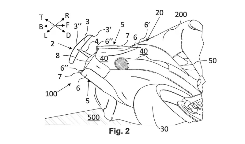 En MotoGP ya han demostrado que los beneficios son ínfimos. En la patente, los de Noale explican técnicamente el sistema formado por dos aletas elevadas sobre un soporte vertical y cuyo fin sería más bien un uso en circuito. Mientras en los coches la idea es que vayan pegados al suelo y mejoren el agarre en el paso por curva, en las motos la idea de Aprilia busca mejorar el rendimiento en recta. Al generar más carga aerodinámica, la rueda se adhiere más al suelo, pero con miras al momento crítico: la frenada. Supuestamente mejora el agarre cuando el motorista se inclina hacia la curva.