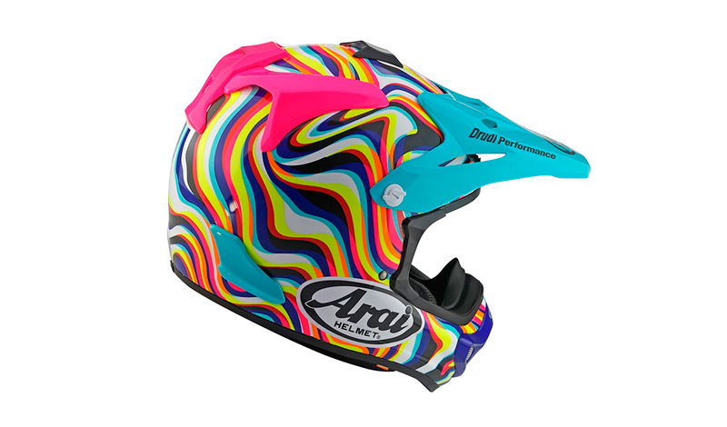 Arai también se preocupa por el estilo y la personalidad de cada piloto. El MX-V EVO está disponible en una variedad de gráficas que van desde opciones sobrias hasta diseños más audaces. Las opciones en Blanco Brillante y Negro Mate ofrecen un look elegante y sencillo, ideal para quienes prefieren un estilo clásico. Para quienes buscan algo más llamativo, Arai presenta la gráfica Track, que combina líneas geométricas con motivos que simulan manchas de barro, utilizando colores vibrantes como azul, rojo y amarillo. La gráfica Stream, con sus líneas curvas y un toque psicodélico, se ofrece en tonos azules y rojos, así como en una versión multicolor con rosa, azul y amarillo. Finalmente, la gráfica Battle destaca por sus líneas geométricas y motivos estelares, y está disponible en morado o en combinaciones de amarillo y rosa.