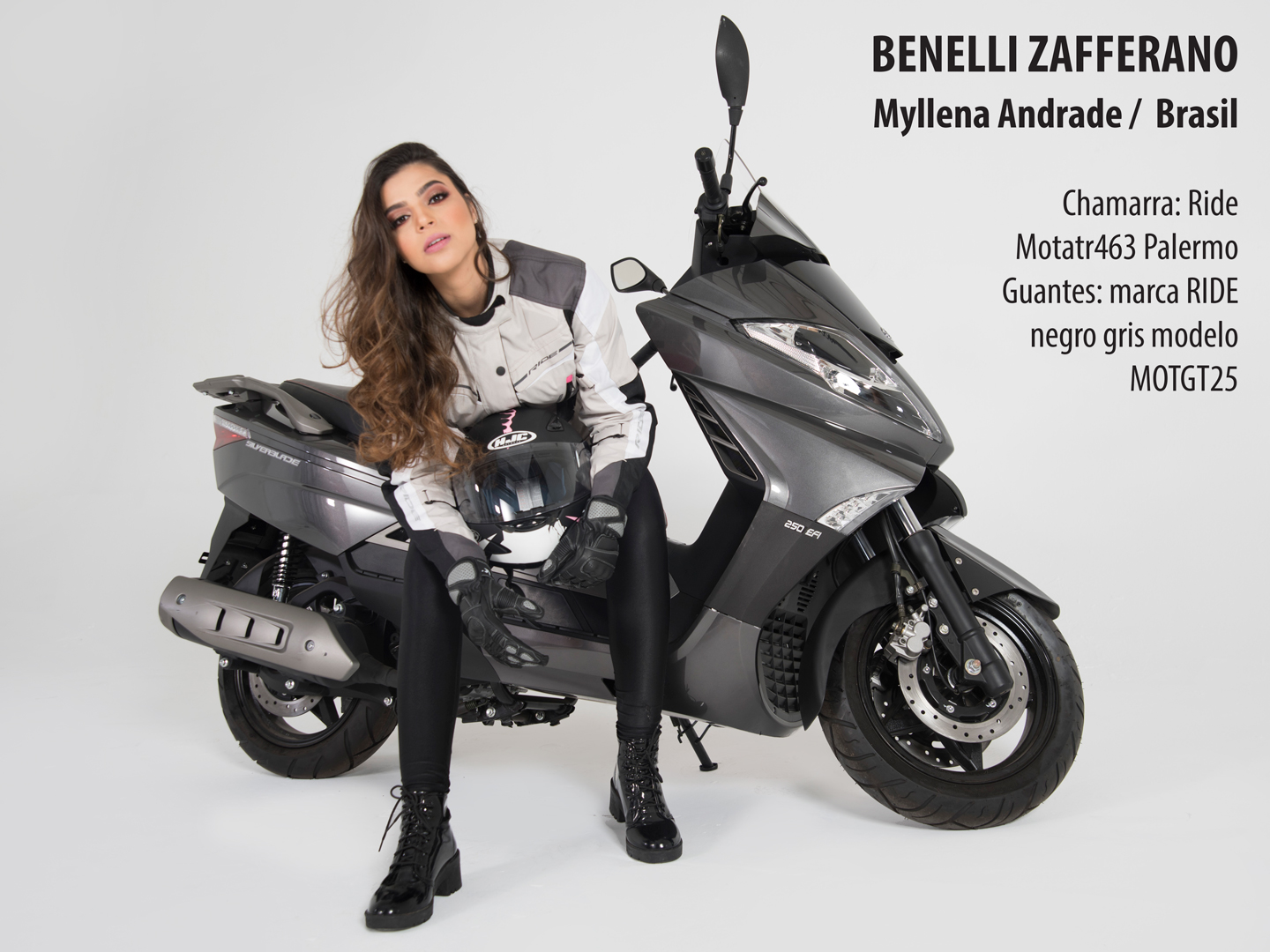 Su diseño es muy cómodo y te permite subir a un acompañante. El Zafferano estará disponible en EXPO MOTO 2019 del 21 al 24 de noviembre en el WTC/Ciudad de México, así como la guapa modelo que lo acompaña. Por el momento te invitamos a disfrutar de la galería de fotos que protagonizaron Myllena y Benelli Zafferano.