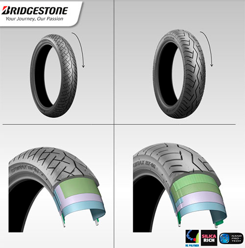 Partiendo de la premisa de destinarse a motos de la vieja escuela, el Battlax BT46 es un neumático tubeless pero que también puede utilizarse con cámara en aquellas llantas que no estén preparadas para trabajar con este tipo de neumáticos. A partir de ahí Bridgestone ha vuelto a sacar todo su repertorio tecnológico y utilizando la tecnología NanoPro-Tech han conseguido una carcasa totalmente nueva. Su interior el compuesto ha conseguido mejorar el agarre y reducir el desgaste gracias a que produce menos fricción. Se ha incrementado el contenido en sílice lo que favorece un mejor agarre en mojado y a bajas temperaturas, pero también se ha mejorado su distribución usando la tecnología RC Polymer.