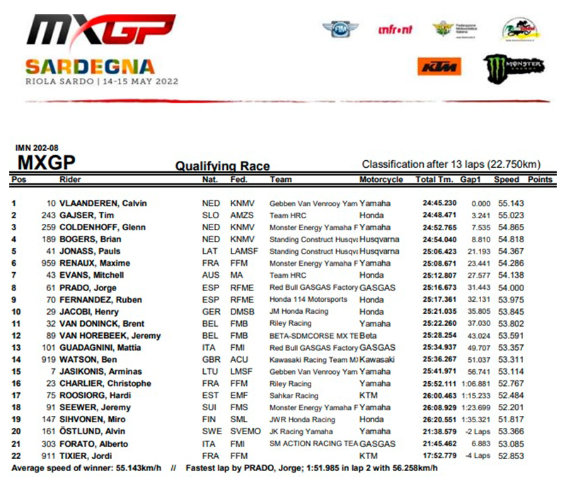 El líder del campeonato Tim Gajser (Team HRC) fue el principal perseguidor de Vlaanderen durante la fase final de la carrera clasificatoria. El holandés no se dejó intimidar y mantuvo firme su posición, recortando el objetivo con un avance de 3.241 ante el esloveno. Glenn Coldenhoff (Monster Energy Yamaha) fue tercero con 7.535 segundos por delante del dúo de Husqvarna de Standing Construct, Brian Bogers y Pauls Jonass. Prado terminó siendo solo octavo.