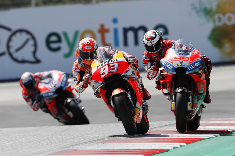 El primero en adelantarse en la curva 1 fue Dovizioso, seguido por Marquez y Lorenzo, pero en cuanto tuvo la oportunidad de tomar la cabeza de la carrera, Marc hizo lo propio y se mantuvo al frente durante la mayor parte de la competencia. Jorge no dejó de insistir, pero movía sus piezas de manera totalmente centrada, para que en el momento exacto pudieran verse las ventajas de su persistencia.