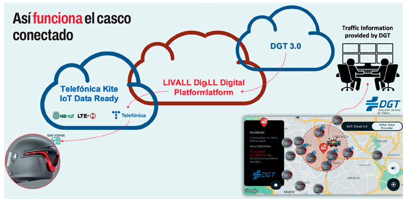 El resultado es un casco conectado a la plataforma DGT 3.0 a través de una tarjeta 4G y 5G. Estas, integradas a través de una ranura en el propio casco, intercambian los datos y abren “un mundo de posibilidades”. En caso de siniestro en carretera, DGT 3.0 emitirá una señal directa al casco de los motociclistas más cercanos, un aviso mediante comando de voz, informando del accidente a todos los usuarios para que estos extremen la atención.