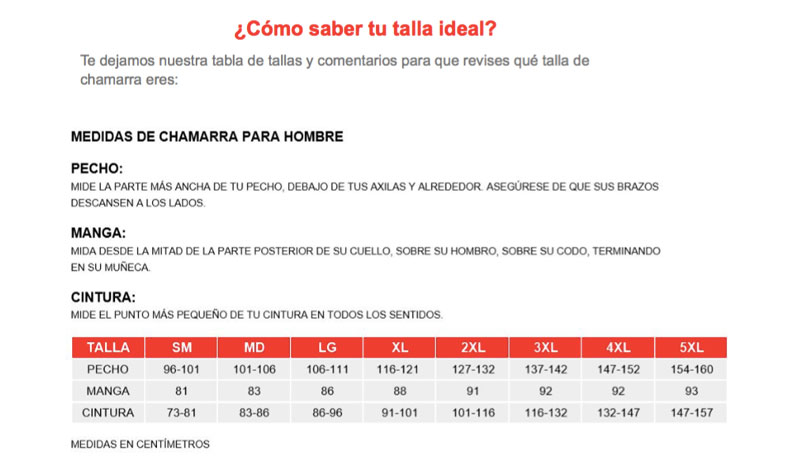 Te dejamos nuestra tabla de tallas y comentarios para que revises qué talla de chamarra eres: