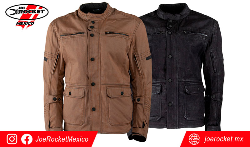 Está construida con una capa exterior de lona encerada resistente. La chamarra está equipada con una armadura removible para los hombros, codos y columna vertebral. Aquí te dejamos su ficha técnica para que no te pierdas ningún detalle.