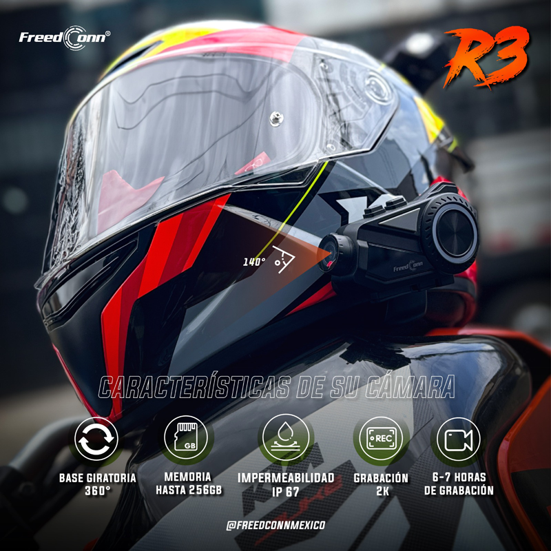 El R3 permite la comunicación entre hasta 6 motociclistas a una distancia de hasta 1.5 kilómetros, lo que lo convierte en una excelente opción para viajes en grupo. La tecnología de cancelación de ruido garantiza que las conversaciones sean claras, incluso a altas velocidades y en ambientes ruidosos. Equipado con una cámara de alta definición que graba en resolución 1080p, captura cada momento del viaje. La cámara es resistente al agua, lo que la hace ideal para diversas condiciones climáticas. Además, tiene la capacidad de grabar en bucle, asegurando que siempre se esté grabando sin importar la duración del viaje.