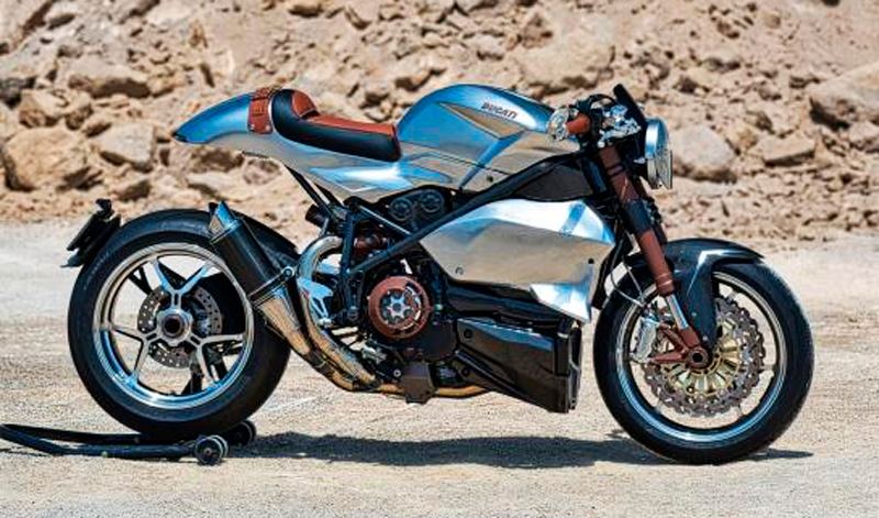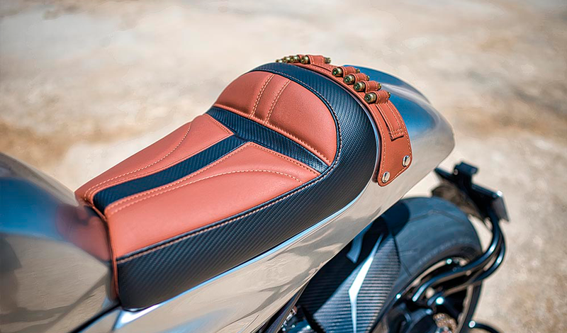 Detalles adicionales como el asiento y el colín revestidos en cuero marrón, unas balas decorativas en la correa de cuero del colín, y componentes especiales como discos lobulados, pinzas radiales, silenciador de escape de carbono y llantas de aleación pulidas a espejo completan la personalización. Incluso incorpora piezas pintadas en marrón metalizado para complementar el diseño.