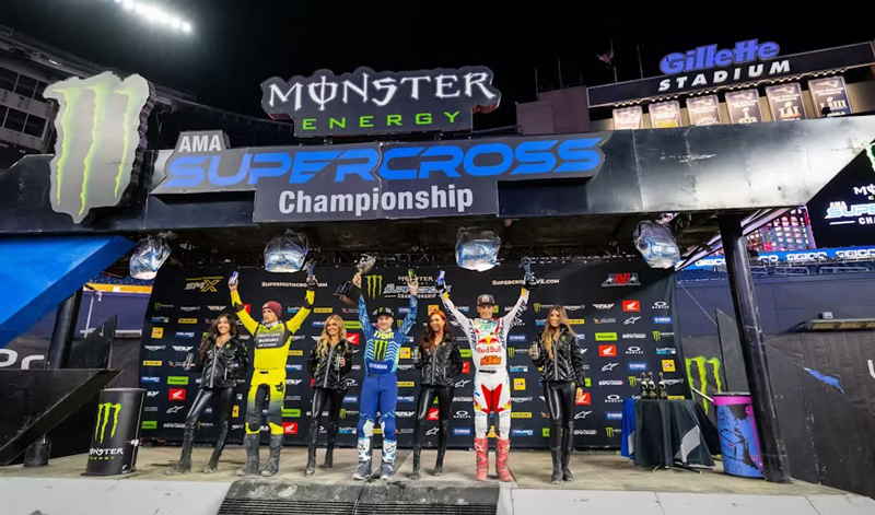 Chase Sexton, de Red Bull KTM Factory Racing, avanzó y desafió el liderato hasta la última vuelta mientras la multitud en el estadio Gillette lo aclamaba. Ken Roczen de Progressive Insurance ECSTAR Suzuki ocupó el segundo lugar durante la mayor parte de la carrera y consiguió el último lugar en el podio cuando ondeó la bandera a cuadros.