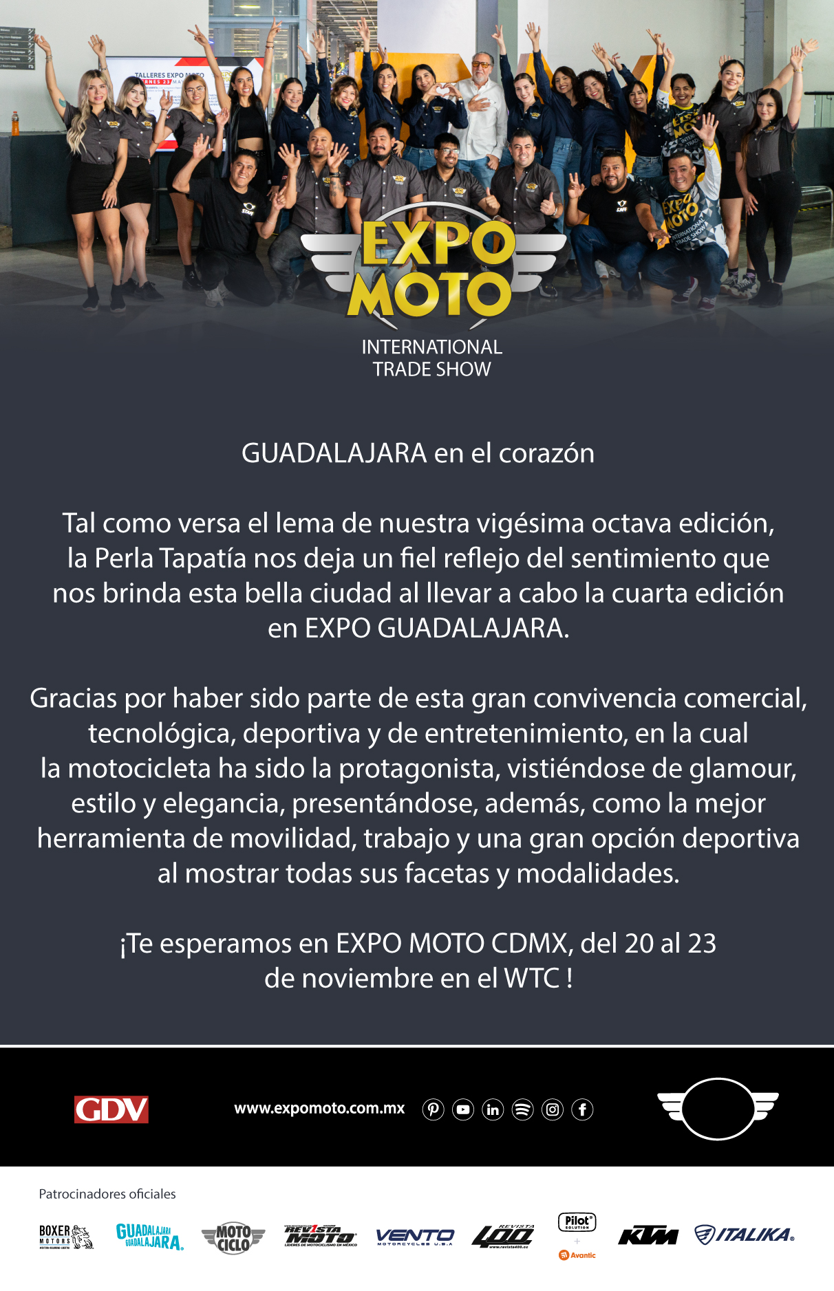 2016-05-28: Este correo electrónico y, en su caso, cualquier fichero anexo, contiene información exclusivamente dirigida a su destinatario. En caso de haber recibido este correo electrónico por error, se ruega notifíquese inmediatamente esta circunstancia a info@expomotonews.com Al mismo tiempo EXPO MOTO le recuerda que sus datos forman o formarán parte de un fichero registrado, propiedad de la EXPO MOTO. Usted tiene derecho de acceso, oposición, rectificación y cancelación a estos datos que deberá ejercer mediante escrito a la dirección anteriormente citada.Expo Moto es una marca registrada. Los logotipos de patrocinadores fueron proporcionados por la misma marca. Queda prohibido el uso de las imágenes difundidas en este correo. © 2013 EXPO MOTO Todos los derechos reservados.