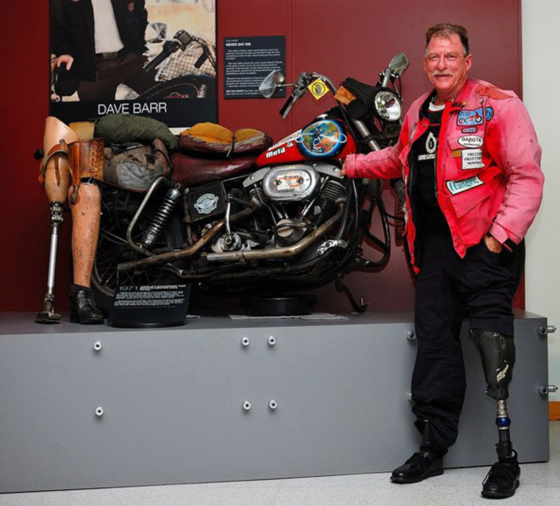 “Ser minusválido no es razón para no poder realizar tus sueños”, nos demuestra Dave Barr, un veterano de la guerra de Vietnam con dos amputaciones de pierna. Este personaje rompió dos récords Guinness: uno por realizar el primer viaje alrededor del mundo en una Harley-Davidson, y el otro por rodar a lo largo y ancho del continente australiano en mes y medio. Cada vez que monta su motocicleta y sale a rodar lo hace con el fin de concientizar al mundo y motivar a las personas que tienen alguna discapacidad para que realicen sus sueños.