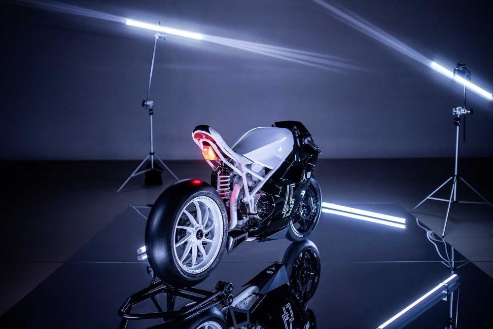 El concepto de esta pieza única se logra al representar la comodidad y aerodinámica de la zapatilla en la moto, por lo robusto del frente en color negro y la ligereza de la parte trasera en color blanco, creando un efecto ying-yang.