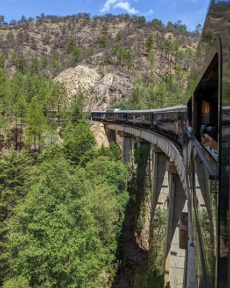 En aproximadamente 9 horas, recorre en tren más de 350 km saliendo de Los Mochis, Sinaloa hacia Creel, Chihuahua, Pueblo Mágico ubicado en el corazón de la Sierra Tarahumara, a lo largo del viaje cruzarás túneles y puentes, joyas de la ingeniería mexicana, además de que disfrutarás de los paisajes de montaña más bellos de México.