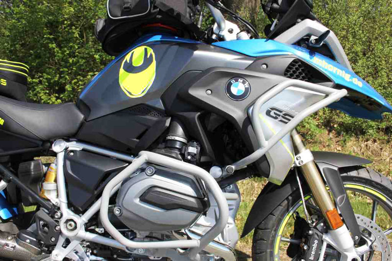 Se hizo un cambio en la tapa del depósito, y así la pieza original fue sustituida por una que sólo puede ser abierta con la llave allen o torque. Entre lo más destacado se encuentran las defensas que protegen al motor, al radiador y al carenado en caso de que la moto caiga del costado en que éstos se encuentran. Con este aditamento estarán fuera de riesgo. Otro punto importante en esta R1200GS es el confort. En este sentido fue sustituido su antiguo parabrisas por un nuevo ZTechnok V-stream, el cual logra disminuir el ruido y evitar posibles dificultades. Para ofrecer una posición mucho más cómoda al conductor fueron aplicados unos elevadores en el manillar, así como en las palancas de freno. .