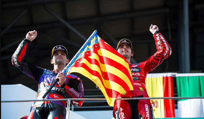En la reanudación, Bagnaia ha protagonizado una espectacular batalla de infarto con Martín para la primera posición durante las primeras cuatro vueltas. Pecco ha conseguido colocarse delante y ha ido aumentando poco a poco su ventaja hasta la bandera de cuadros, convirtiéndose en el sexto piloto de la historia que logra sumar 10 victorias en una sola temporada. Además, ha sido el podio 50 del piloto italiano en la categoría reina.