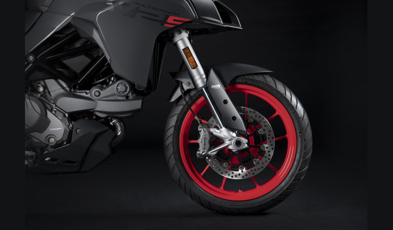 El chasis de la motocicleta es ágil e intuitivo, con una rueda delantera de 19 “que asegura una conducción suave y cómoda, siempre con el nivel adecuado de reactividad y precisión. Extremadamente versátil, la motocicleta también es ideal para uso urbano, gracias a la efectividad del Sistema de suspensión semiactiva Ducati Skyhook Suspension EVO (de serie en la versión S), que puede absorber las asperezas y desniveles del suelo y garantizar siempre la puesta a punto ideal del vehículo, mejorando la seguridad y el confort.