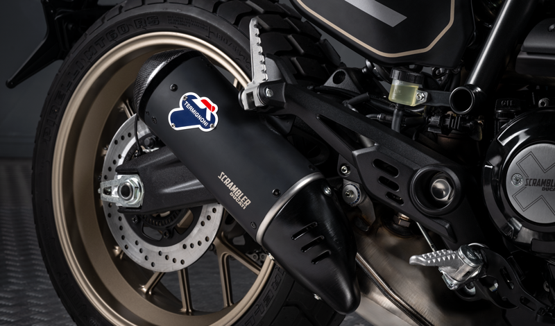 El carácter deportivo de la Full Throttle 2025 se subraya con la tapicería del asiento y el diseño clásico negro y bronce —color que también adoptan las llantas de aluminio, inspiradas en las motos y los coches de carreras de los años setentaؙ—, así como con el acabado negro de los protectores térmicos del escape y las tapas laterales delanteras. Para realzar el alma Tracker de la Full Throttle, cuenta con un manillar rebajado con sección variable, un guardabarros delantero corto y un colín sin guardabarros trasero. El toque de belleza se lo dan el silenciador homologado Termignoni, los intermitentes LED Ducati Performance* y el cambio de marchas Ducati Quick Shift up/down de serie.