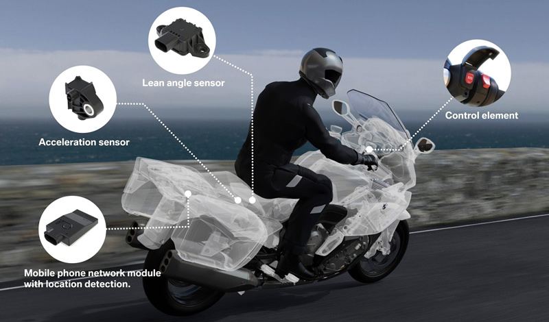 El IMU también sirve para sistemas de seguridad pasiva como el BMW E Call para motos, como el que incorpora la BMW K 1600 GT. Se trata de la herramienta que controla cuándo la moto ha tenido una caída y debe lanzar la señal de ayuda al centro de emergencias. Es capaz de detectar si la moto ha sufrido una caída grave o leve gracias al registro de la posición de la moto en los tres planos. En el caso de la caída grave lanza un mensaje de socorro inmediatamente y en el caso de una caída leve, por ejemplo, en parado mientras maniobramos, espera unos segundos antes de lanzar el mensaje de aviso, lo suficiente para que el conductor decida si es necesaria la intervención de los servicios de emergencia o no.