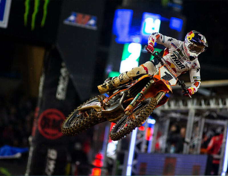 Carrera uno : no hay escasez de dramatismo en la clase 450SX. Marvin Musquin saltó a la delantera y ocupó el lugar sobre Jason Anderson y Malcolm Stewart. Stewart pasó rápidamente a la segunda posición y no perdió tiempo en sortear a Musquin, quien detuvo su moto en una curva.