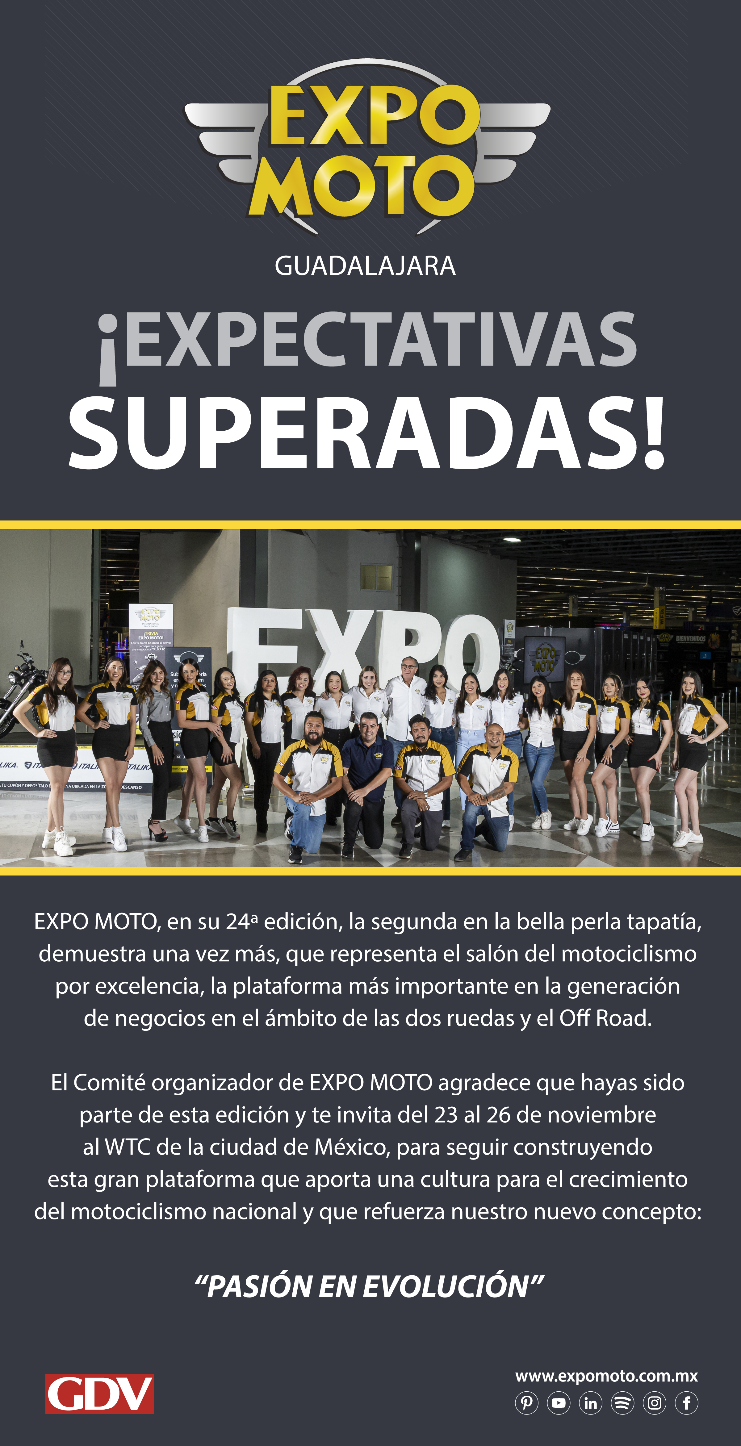 2016-05-28: Este correo electrónico y, en su caso, cualquier fichero anexo, contiene información exclusivamente dirigida a su destinatario. En caso de haber recibido este correo electrónico por error, se ruega notifíquese inmediatamente esta circunstancia a info@expomotonews.com Al mismo tiempo EXPO MOTO le recuerda que sus datos forman o formarán parte de un fichero registrado, propiedad de la EXPO MOTO. Usted tiene derecho de acceso, oposición, rectificación y cancelación a estos datos que deberá ejercer mediante escrito a la dirección anteriormente citada.Expo Moto es una marca registrada. Los logotipos de patrocinadores fueron proporcionados por la misma marca. Queda prohibido el uso de las imágenes difundidas en este correo. © 2013 EXPO MOTO Todos los derechos reservados.