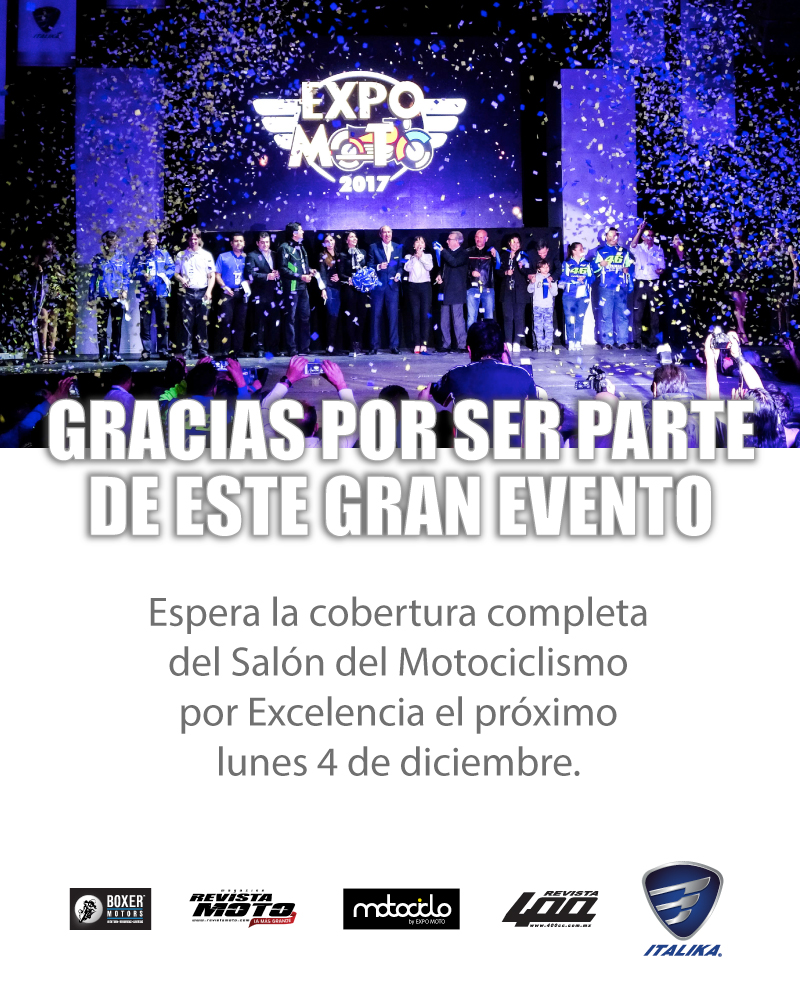 2016-05-28: Este correo electrónico y, en su caso, cualquier fichero anexo, contiene información exclusivamente dirigida a su destinatario. En caso de haber recibido este correo electrónico por error, se ruega notifíquese inmediatamente esta circunstancia a info@expomotonews.com Al mismo tiempo EXPO MOTO le recuerda que sus datos forman o formarán parte de un fichero registrado, propiedad de la EXPO MOTO. Usted tiene derecho de acceso, oposición, rectificación y cancelación a estos datos que deberá ejercer mediante escrito a la dirección anteriormente citada.Expo Moto es una marca registrada. Los logotipos de patrocinadores fueron proporcionados por la misma marca. Queda prohibido el uso de las imágenes difundidas en este correo. © 2013 EXPO MOTO Todos los derechos reservados.