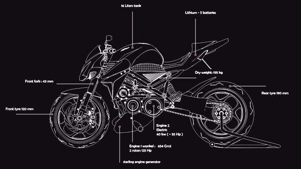 El fabricante francés ha publicado este proyecto que cuenta con un motor Wankel y uno eléctrico; esta combinación desemboca una potencia de 180 CV y un par motor de 205 Nm, dando como resultado un motor rotativo birrotor de 654 cc que trabaja conjuntamente con el motor eléctrico que funciona gracias a sus baterías de litio y se ubica en el eje del basculante. El tanque de combustible tiene capacidad de 16 litros, mientras que el motor eléctrico es alimentado gracias a cinco pequeñas baterías de litio.