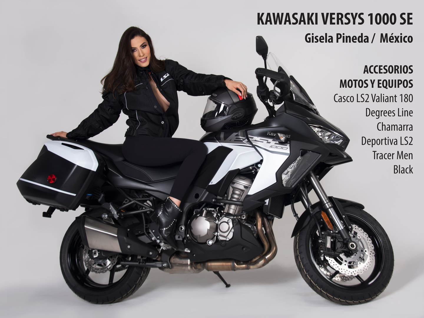 Para su sesión fotográfica Gisela utilizó un casco de la marca LS2 Valiant 180 Degress Line, así como una chamarra deportiva de la misma marca diseño Tracer Men Black.