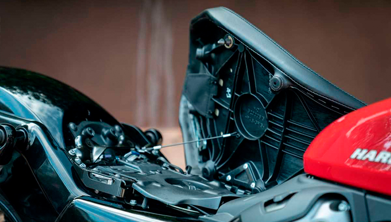 También se ha trabajado mucho para reducir al máximo el peso de la moto; menos peso significa mayor manejabilidad y menor consumo. El asiento monoplaza, pequeño y corto, está a 698 mm del suelo, por lo que es una moto realmente muy baja y accesible. El depósito de combustible de 11,7 litros está bajo el asiento, con la boca de llenado también en esta zona. El falso depósito sobre el motor es el aírbox del sistema de inyección.