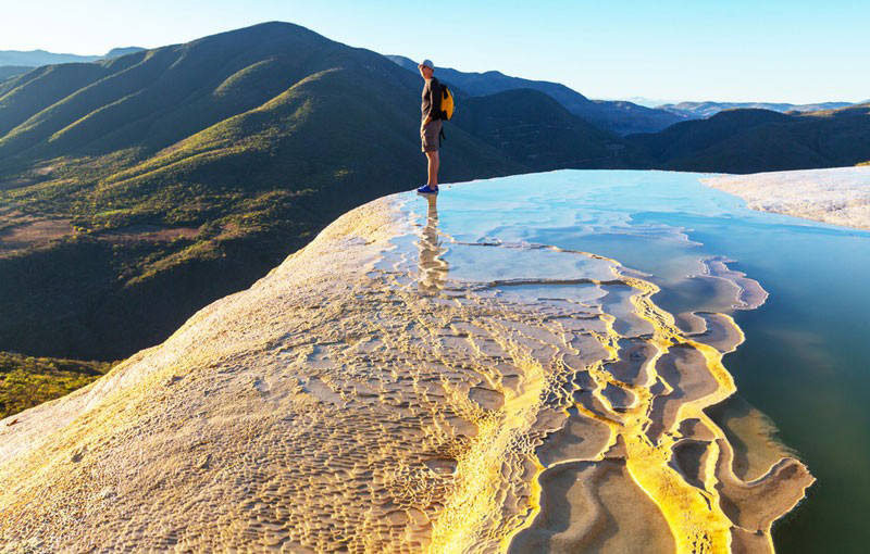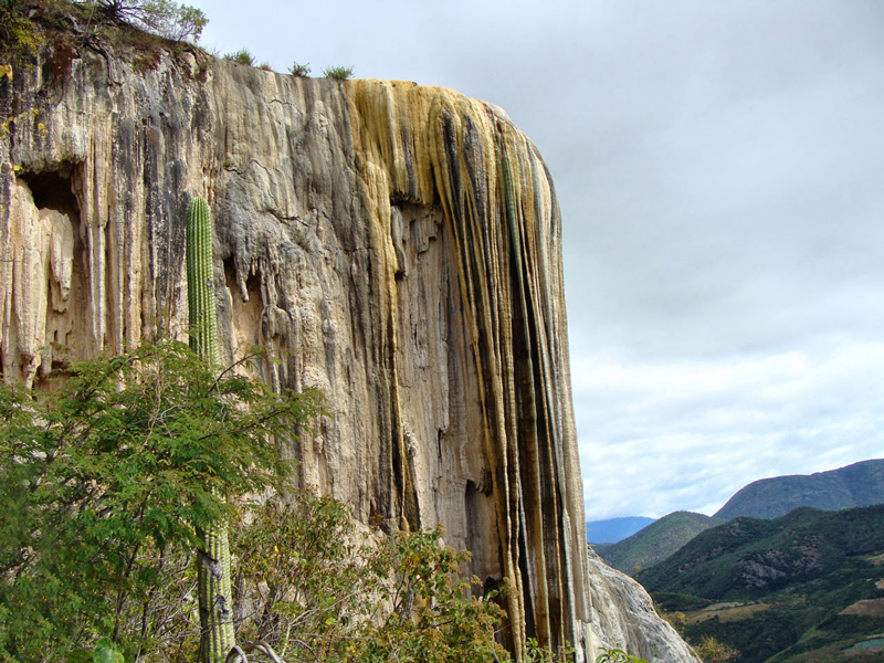 Hierve el Agua, un apacible lugar en el estado de Oaxaca, cuyo principal atractivo son sus dos impresionantes cascadas petrificadas de origen natural, con una altura entre 12 y 30 metros, que se proyectan hacia una barranca de más de 200 metros de profundidad, ambas formadas por carbonato de calcio hace miles de años; un fenómeno ocasionado por el escurrimiento de agua con alto contenido de minerales.