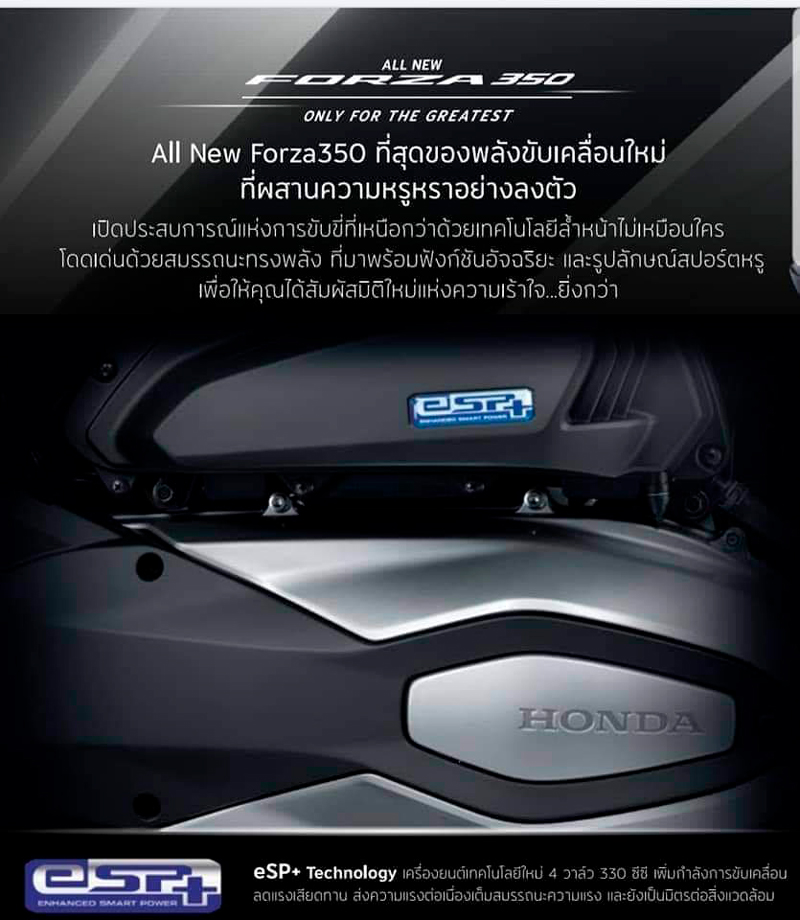 En las fotografías que llegaron de Tailandia se aprecian varias bondades de la unidad. En este catálogo aparecen las especificaciones de la nueva Forza 350, y muestran un nuevo motor SOCH DE 4 válvulas, refrigerado por agua. Actualmente cubica 329.6 cc, anteriormente 276 cc, y es aquí precisamente donde radica su fuerza principal.