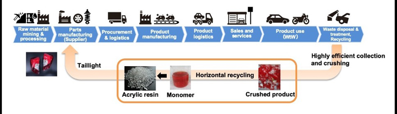 La resina acrílica utilizada en estos paneles ha sido desarrollada en colaboración con Mitsubishi Chemical, utilizando pilotos traseros de vehículos al final de su vida útil.