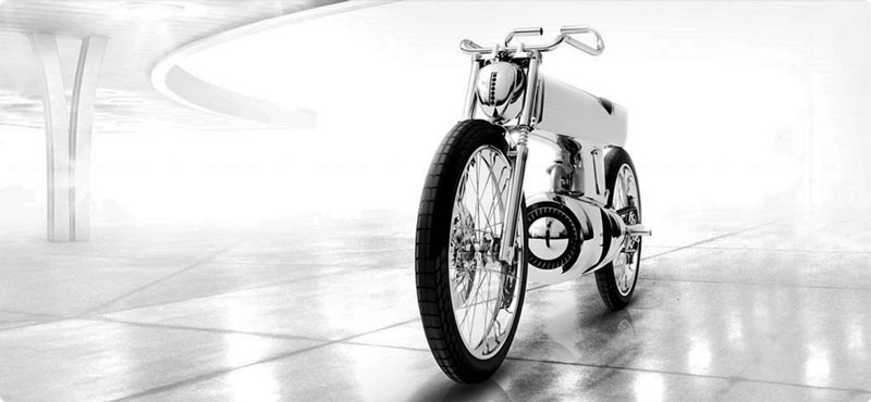 Lo llamativo de esta bella máquina es que su cuerpo se asemeja al de una pistola cromada de acero. Tiene motor monocilíndrico oculto tras un carenado, que simula estar conectado a un reactor o una turbina. Y su manillar en forma de ele que nos recuerda a de una de las motos levitantes de la saga galáctica más famosa del planeta, Star Wars.