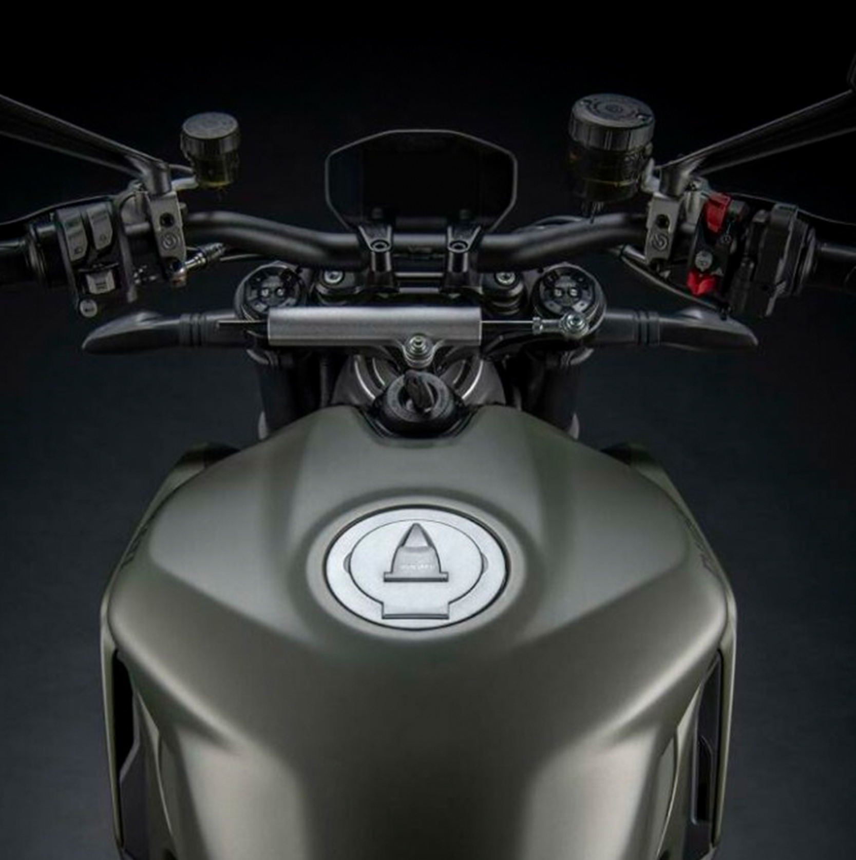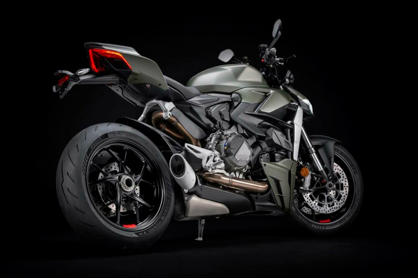 El nuevo color verde mate metalizado ha sido especialmente pensado para esta moto desde el Centro de Diseño de Borgo Panigale: Realza las líneas limpias, nítidas y esenciales de la Streetfighter V2, reforzando el carácter único de la moto y su capacidad innata para atraer la atención. El acabado mate se combina a la perfección con el contexto cromático de las partes mecánicas, mientras que el grano metálico crea un juego de contrastes muy evidente en las diferentes superficies.