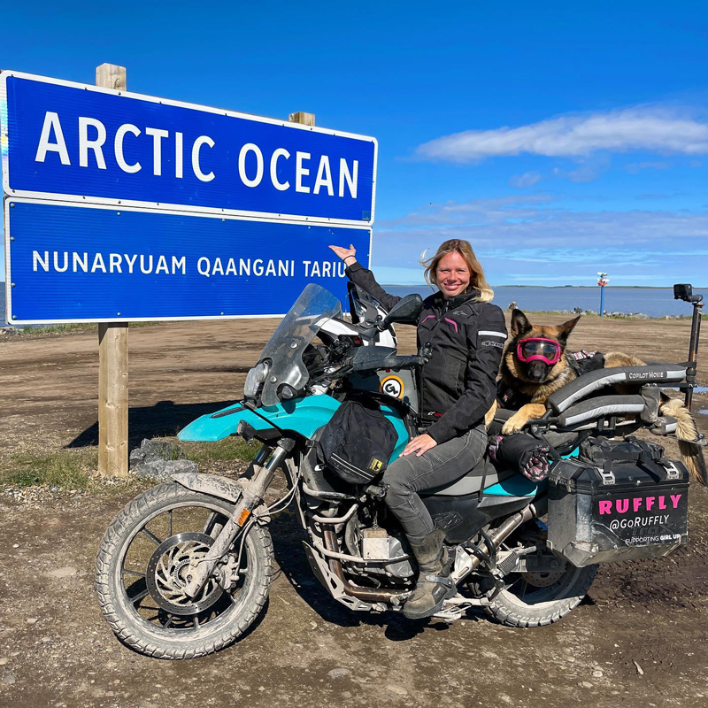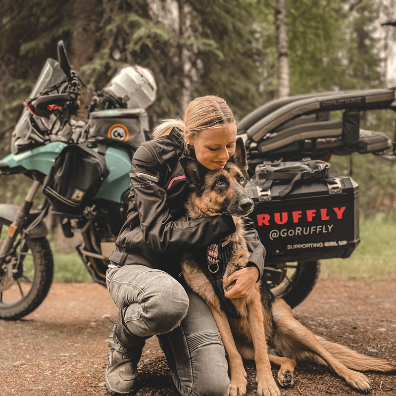 Jess Stone, motociclista, dueña de un perro, empresaria y defensora de los animales, es un miembro de la comunidad de motociclistas a la que hemos estado siguiendo de cerca. Stone es la fundadora de Ruffly, una empresa ética de artículos para perros. Ha pasado gran parte de su vida haciendo labor de ayuda en diferentes países, operando con una mirada compasiva y ansiosa que se ha mantenido en el centro de su negocio actual. No solo eso, sino que Stone tiene próximamente un viaje alrededor del mundo con su esposo Greg y su pastor alemán Moxie, por una causa más que puro disfrute: el viaje serviría para recaudar fondos en apoyo de la organización Girl Up.