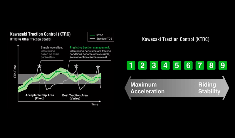 El S-KTRC es un sistema de control de tracción predictivo original de Kawasaki que emplea la misma tecnología de base que las máquinas de competición desarrolladas por Kawasaki para el MotoGP, la máxima categoría del motociclismo. Esta tecnología controla en forma continua el deslizamiento del neumático trasero que se produce al aplicar potencia para garantizar una aceleración óptima. En general, la tracción máxima hacia delante requiere un cierto grado de deslizamiento (por lo general, una relación de deslizamiento del 20 al 30%; es decir, la rueda trasera gira entre un 20 y un 30% más rápido que la delantera). A fin de garantizar la mayor eficacia en la transferencia de potencia al asfalto, el S-KTRC supervisa la relación de deslizamiento en tiempo real y controla la generación de potencia del motor para optimizar la tracción del neumático trasero.