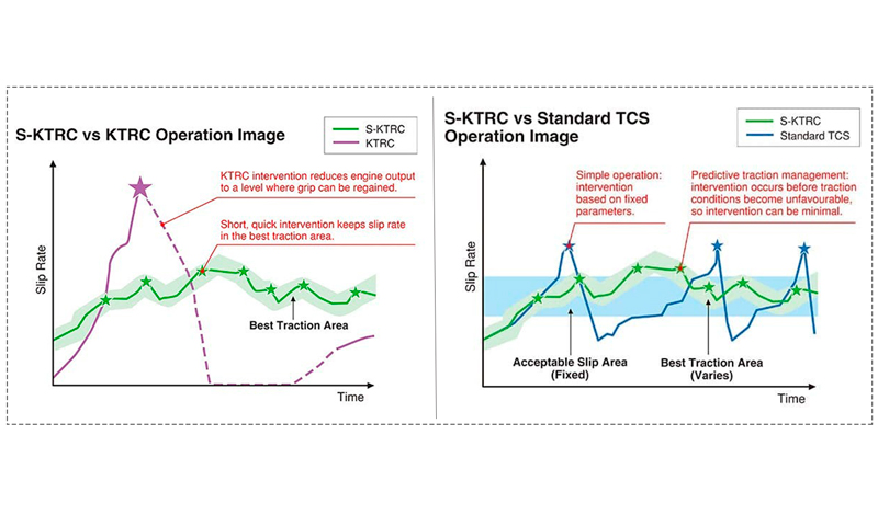El KTRC emplea sensores de velocidad de neumáticos para controlar la velocidad a la que giran las ruedas delantera y trasera. Al detectar el deslizamiento de un neumático, la potencia del motor se reduce para que el neumático trasero cuánto se pierde agarre una forma momentánea, por ejemplo, al pasar sobre una boca de alcantarilla mojada.