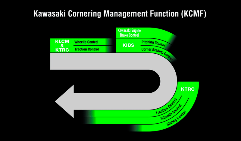 Con la última evolución del software de modelado avanzado de Kawasaki y la información de una IMU (unidad de medida de inercia) compacta que incluso proporciona una imagen en tiempo real más clara de la orientación del chasis, KCMF supervisa los parámetros de chasis y motor en todo el giro, desde la entrada, pasando por el vértice hasta la salida, modulando la fuerza de freno y la potencia del motor para facilitar una suave transición de la acelerada a la frenada y de vuelta, y para ayudar a los conductores a realizar la trazada correcta. Los sistemas que KCMF supervisa varían según el modelo, pero pueden incluid: