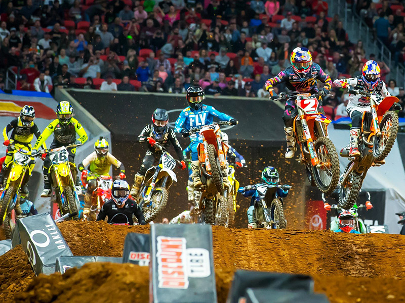 Al dar el banderazo de arranque, Webb se impone con una velocidad impresionante, apoderándose del holeshot y adelantándose del resto de sus compañeros, asegurándose de esta manera que el primer lugar sería suyo. Tras él, vimos a Musquin y Baggett, el primero de estos también jugó un buen papel durante la contienda, pues lo vimos darle batalla desde muy cerca a Webb, sin embargo un pequeño incidente entre ambos pilotos, – que aunque no pasó a mayores-, lo hizo perder la ventaja conseguida hasta ese momento, arrastrándolo hasta el tercer puesto. Blake Bagget, seguro y conciso en cada uno de los movimientos, llega tras Musquin, generándose de esta manera un triplete autentico para la firma austriaca KTM.