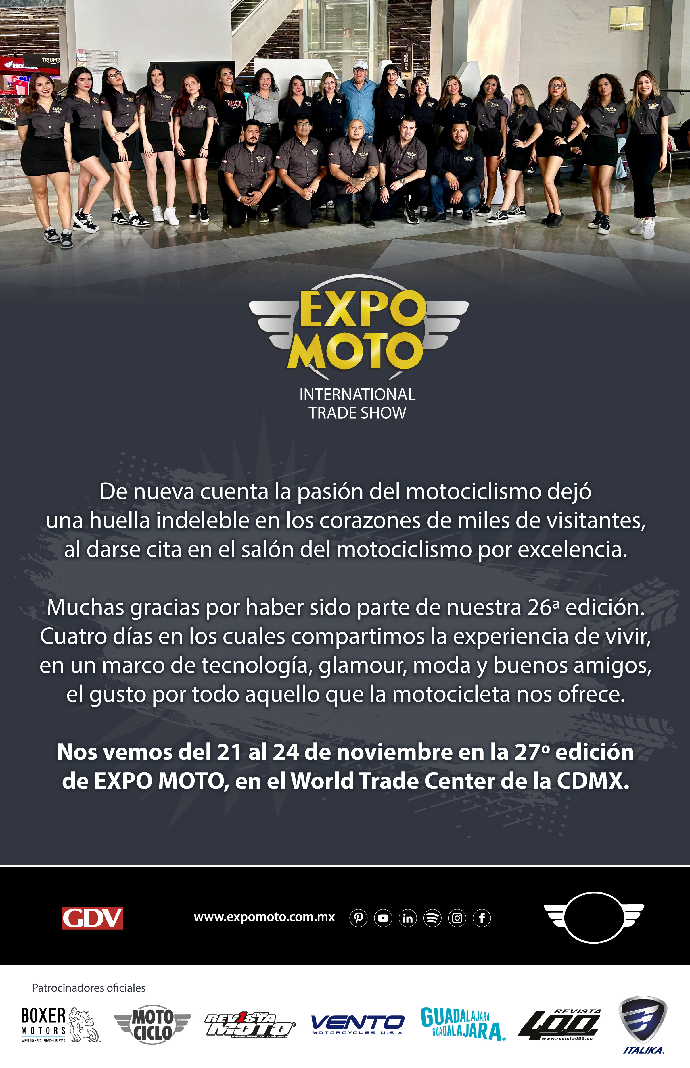 2016-05-28: Este correo electrónico y, en su caso, cualquier fichero anexo, contiene información exclusivamente dirigida a su destinatario. En caso de haber recibido este correo electrónico por error, se ruega notifíquese inmediatamente esta circunstancia a info@expomotonews.com Al mismo tiempo EXPO MOTO le recuerda que sus datos forman o formarán parte de un fichero registrado, propiedad de la EXPO MOTO. Usted tiene derecho de acceso, oposición, rectificación y cancelación a estos datos que deberá ejercer mediante escrito a la dirección anteriormente citada.Expo Moto es una marca registrada. Los logotipos de patrocinadores fueron proporcionados por la misma marca. Queda prohibido el uso de las imágenes difundidas en este correo. © 2013 EXPO MOTO Todos los derechos reservados.