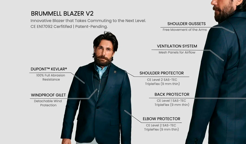 Brummell, una marca joven de equipamiento para motociclistas, lanzó la primera versión de la Blazer en 2021, mismo año en que se presentó en el EICMA de Milán. Hoy en día, ofrece una versión mejorada: la Blazer V2. Fabricada en lana especial, esta chaqueta cuenta con un interior 100 % DuPont Kevlar y protectores de impacto SAS-TEC Tripleflex CE Nivel 2 para hombros y codos. También dispone de un protector de espalda CE Nivel 1 SAS-TEC Tripleflex, y cumple con la normativa EN 17092:4-2020, que garantiza su seguridad y fiabilidad.