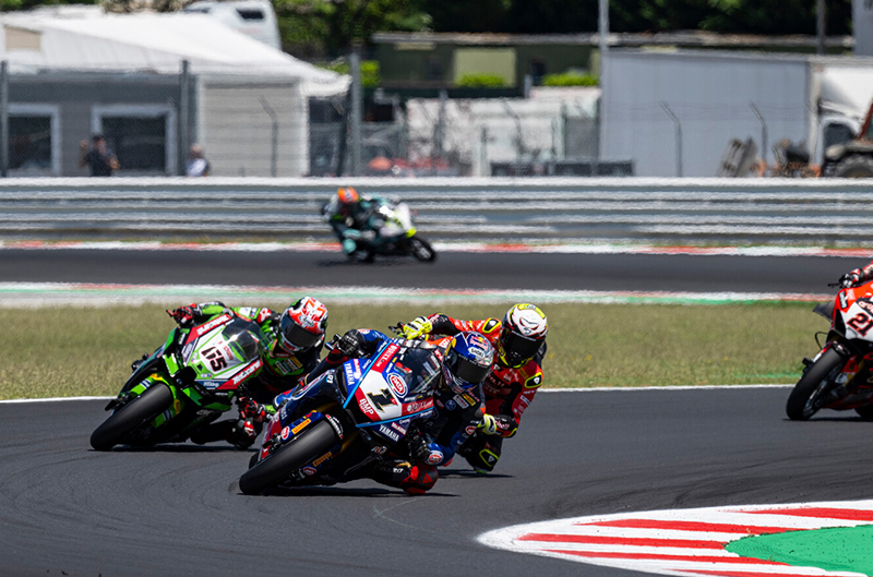 Rea y Razgatlioglu se encontraban muy de cerca, con un ritmo claramente más lento que el de las Ducati. No solo Bautista estaba bloqueado detrás, sino que también Axel Bassani y Michael Ruben Rinaldi aguantaban la rueda del grupo. No fue hasta que Rea cambió el ritmo, y así, Bautista rápidamente pasó a la primera posición.