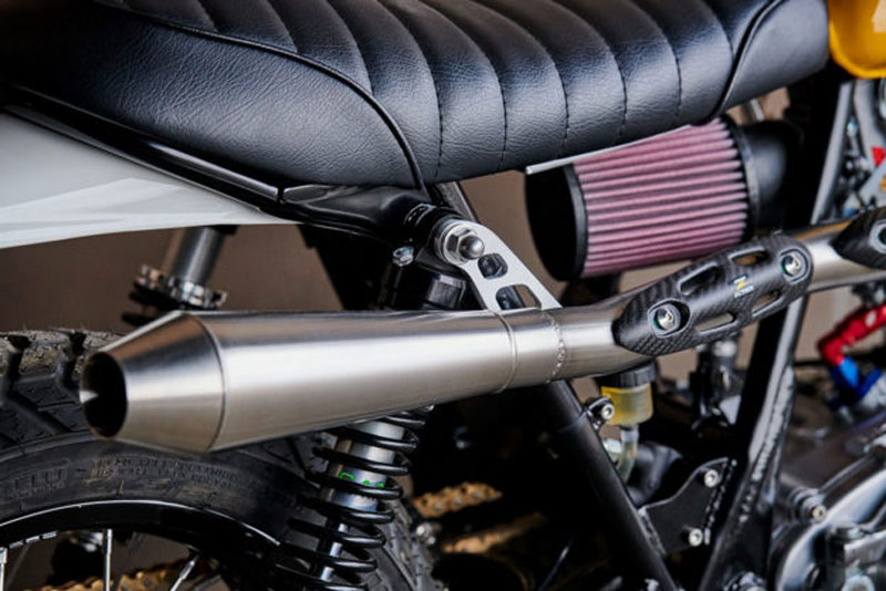 El encendido es de Powerdynamo, mientras que la bomba del aceite es de la marca Kedo. Cuenta con un escape de posición elevada con salida lateral por la derecha, semejando el estilo de las scrambler.