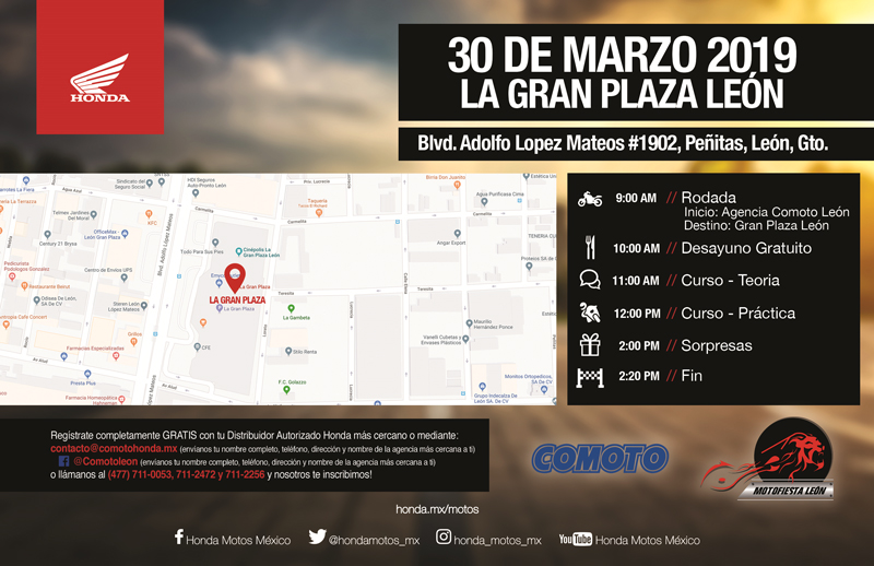 Acompáñanos a recibir la capacitación necesaria para dominar tu motocicleta en el camino, propiciando que tus trayectos sean siempre seguros. La cita es el próximo 30 de mayo en la Gran Plaza León, Gto. Iniciaremos con una rodada, para proseguir con desayuno e iniciar los cursos teóricos y prácticos.