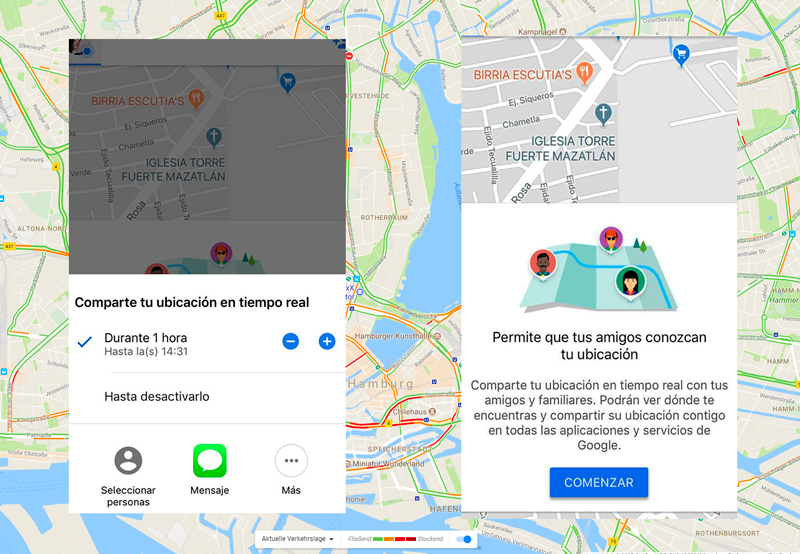 Lo bueno de Google Mpas es que aunque no tengamos cuenta en gmail se puede utilizar igualmente. En ambos casos, para compartir nuestra ubicación tenemos que abrir la aplicación en el teléfono (está disponible para iOS y Android). Una vez dentro hay que acceder al menú y ahí nos permitirá seleccionar la opción “Compartir ubicación”.
