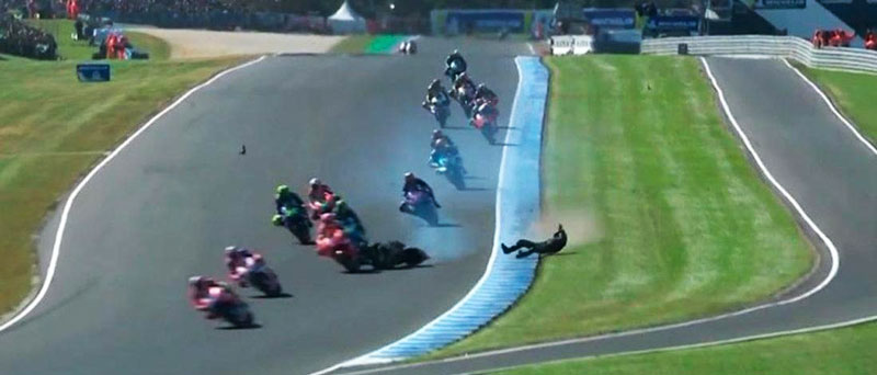 Zarco también quería adelantar al piloto de Honda, pero de repente la rueda trasera de la moto Honda chocó contra la delantera dela Yamaha satélite en plena frenada y Zaco cayó a 300 km/h, una caída que no tuvo ninguna consecuencia y el piloto salió ileso, por otro lado la Honda de Márquez quedó sumamente dañada forzando la retira del español.